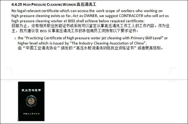 近日,拜耳材料科技(上海)有限公司在乙方清洗施工中,將中國(guó)工業(yè)清洗協(xié)會(huì)頒發(fā)的“高壓水射流清洗工執(zhí)業(yè)資格證書(shū)(初級(jí))”納入管理程序文件,作為拜耳公司關(guān)于“高壓水清洗”資質(zhì)要求的相應(yīng)制度。