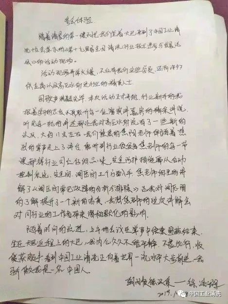 10月14日-19日,2019年第二屆全國工業清洗行業高壓水射流清洗技術培訓在合肥與第十九屆清洗行業年會同期舉辦。朝陽順德環??萍加邢薰拘旌戚x前來參加本次培訓,收獲頗豐,有感而發,手寫了一份培訓感想,與學員們分享: