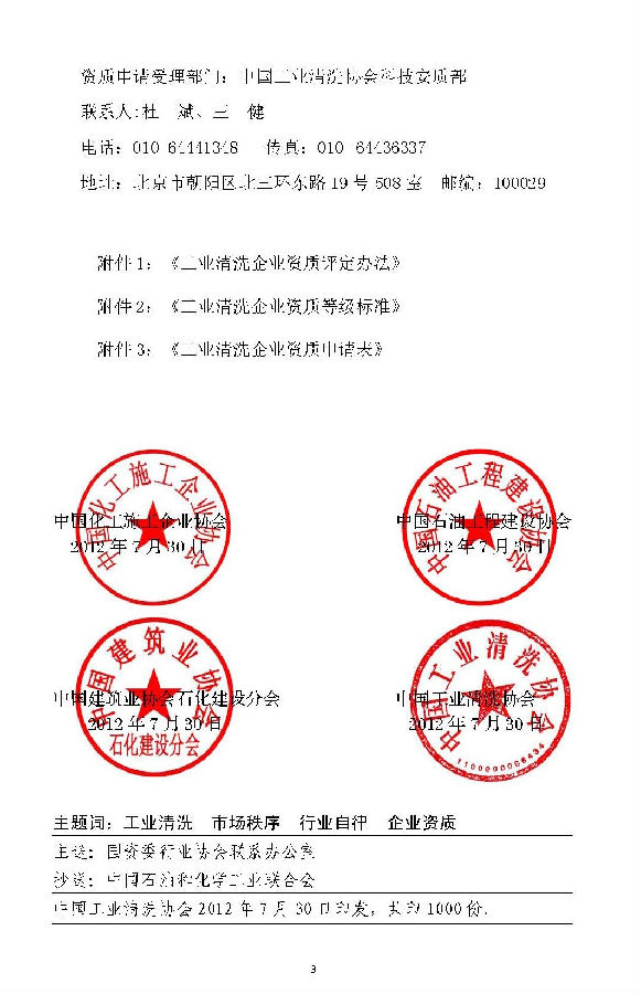 ? ?工業清洗行業規范市場 秩序、強化行業自律、實施工業清洗資質管理工作在中國化工施工企業協會、中國石油工程建設協會、中國建筑業協會石油化工建設分會監督指導下,由中國工業清洗協會組織實施。請各單位在試行中注意總結和發現問題,及時反饋到中國工業清洗協會,以便今后進一步修改完善。